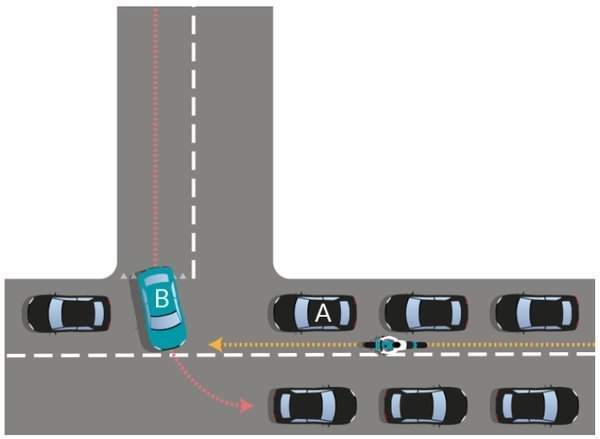 - Een autobestuurder A die in dezelfde richting beweegt, stopt bij een kruispunt om voorrang te verlenen aan autobestuurder B die de rijbaan in de tegenovergestelde richting oprijdt.