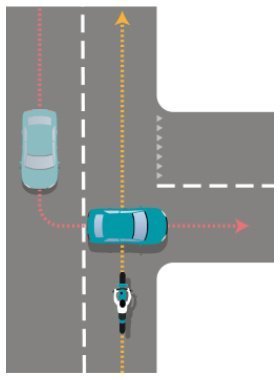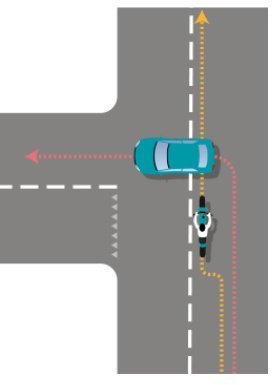 - Een autobestuurder wil links afslaan op een voorrangsweg. Hij steekt de weg over, maar snijdt daarbij de pas af van een motorrijder die van links komt.