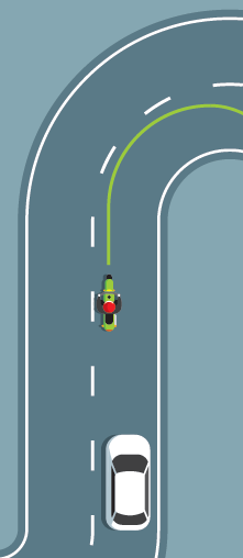 • Hou er rekening mee dat tegenliggers soms gedeeltelijk op de verkeerde rijstrook of weghelft rijden, en hou je klaar om in een bocht naar rechts vroeger in te kantelen en in een bocht naar links later in te kantelen.